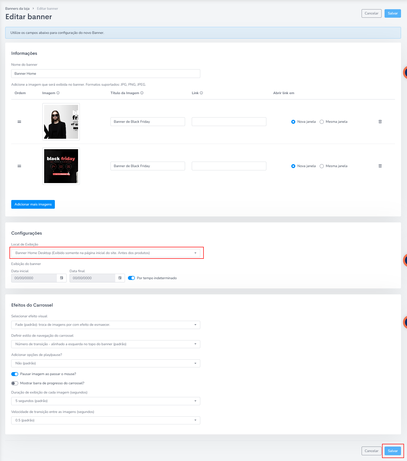 ou as imagens caso ele seja rotativo, o link de cada banner (caso tenha) e o Local de exibição: Banner Home,